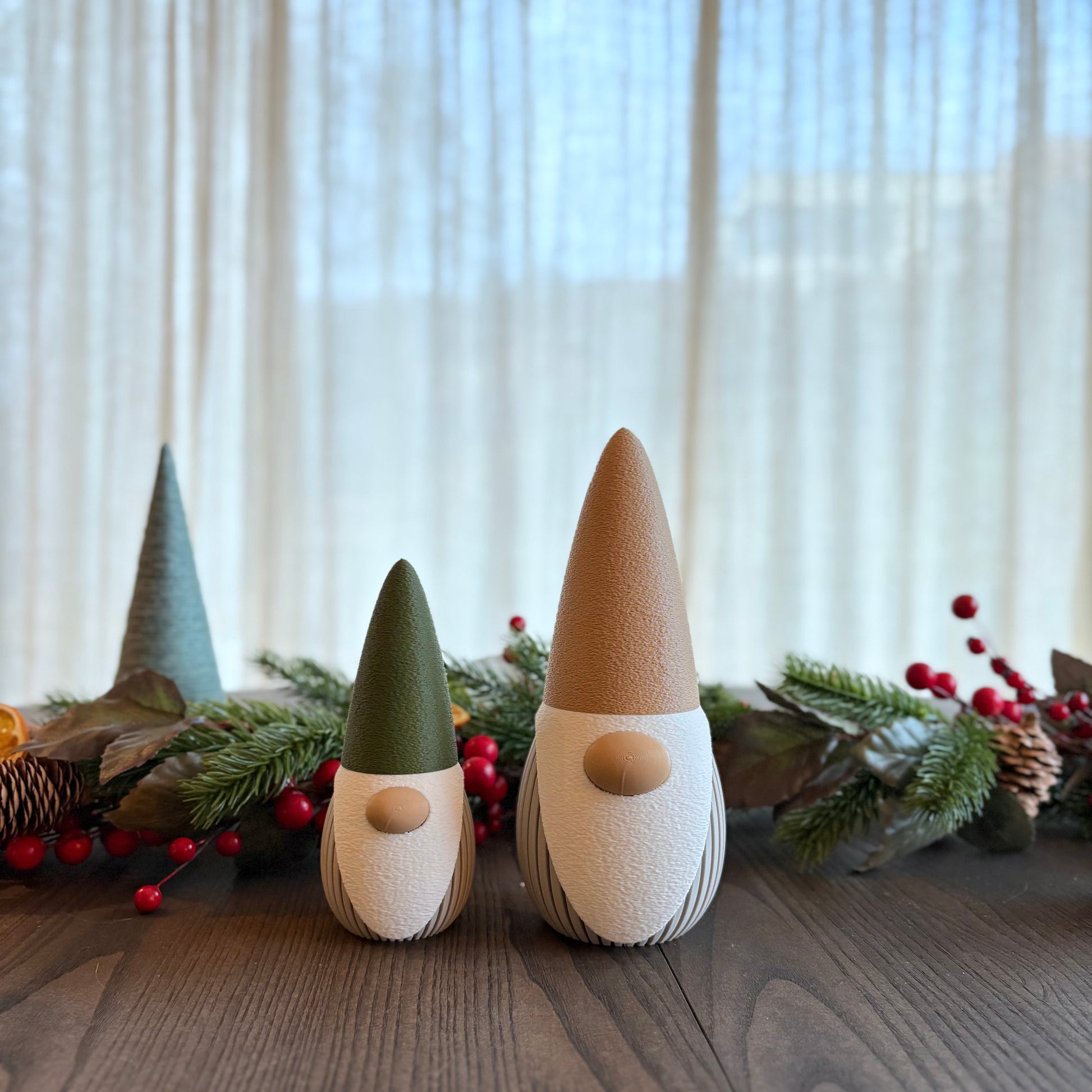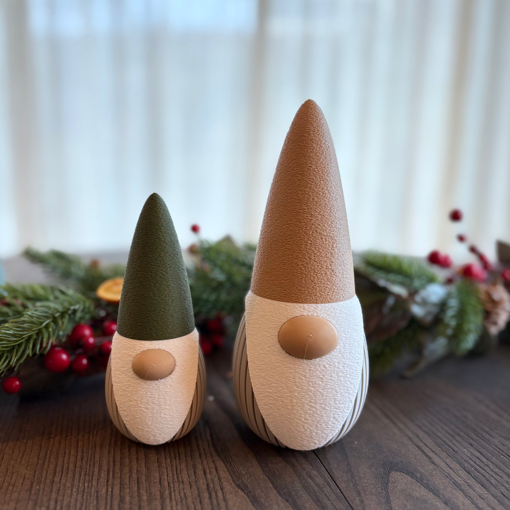 Settet er 3D-printet i matt PLA, et miljøvennlig og plantebasert materiale. Kroppene har en elegant rillet struktur, mens skjegget og luene er printet i en grovere tekstur som gir fin dybde og kontrast i uttrykket. De to figurene er 14 og 19 cm høye, og kommer i dempede beige nyanser med luer i grønt og beige.
