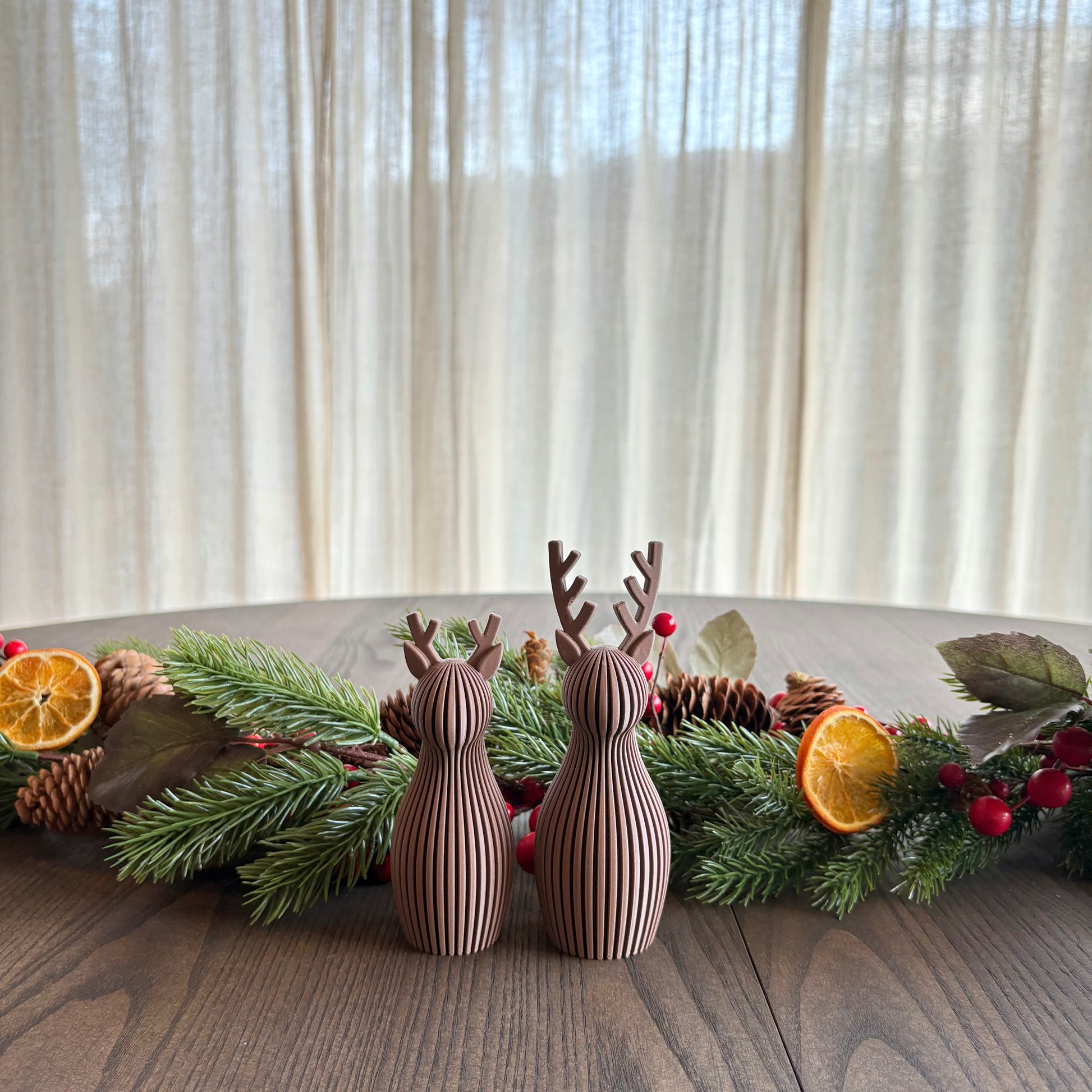 Reinsdyrene er 3D-printet i matt finish i fargen Dark Brown. Materialet er et biologisk nedbrytbart og miljøvennlig biopolymer, noe som gjør dem både pene og ansvarlig produsert. Den matte overflaten skaper et varmt og moderne uttrykk som passer inn i de fleste hjem.